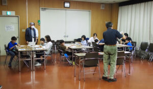 最初に飛行機が飛ぶ原理の説明を聞きながらペーパーグライダーの組立。皆さん一生懸命に組立。テスト飛行では、自分で作ったペーパーグライダーが飛ぶ様子を見て大喜び。