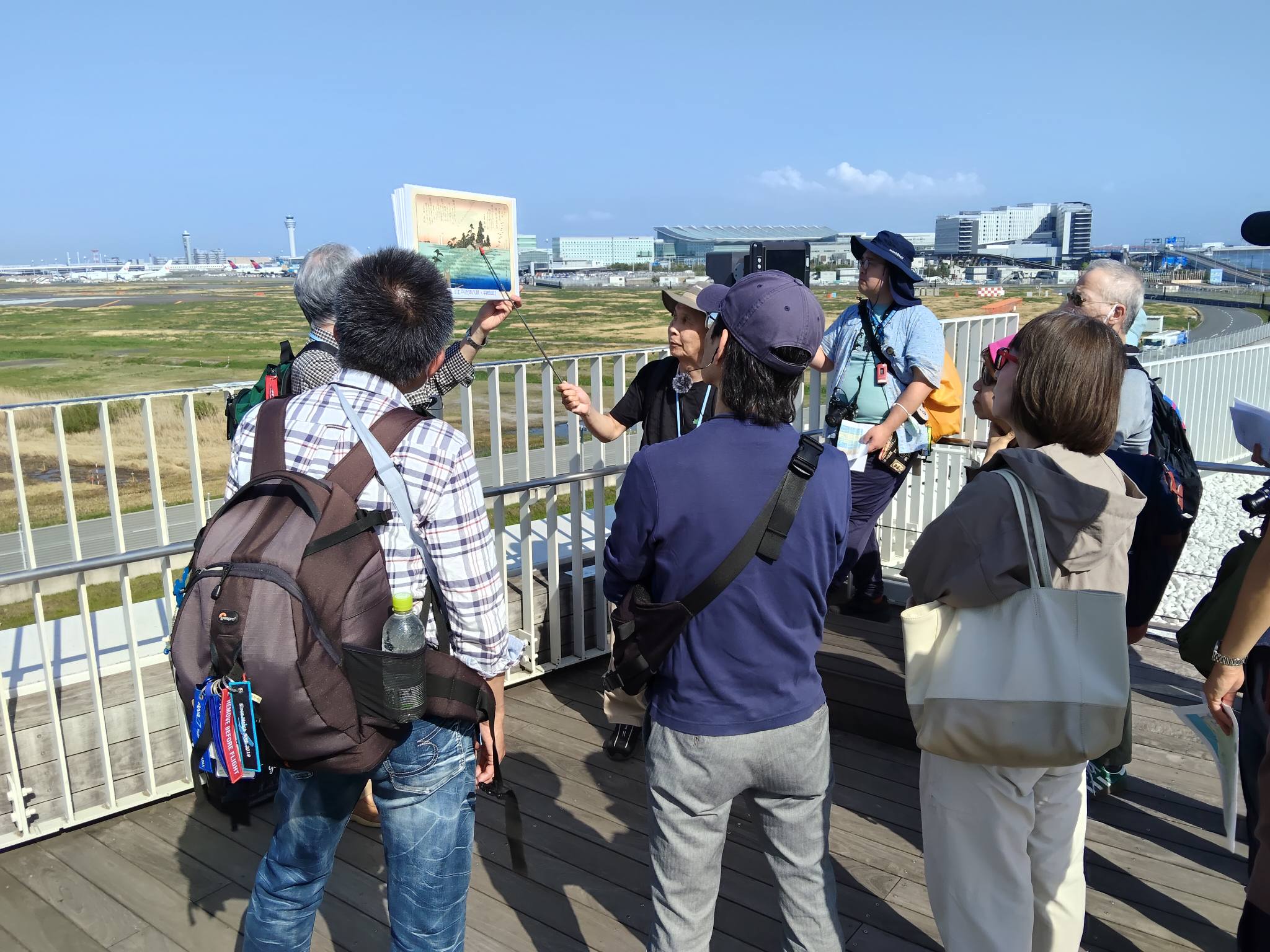 いつものようにHICityの足湯スカイデッキで羽田空港を見渡しながら、羽田空港の歴史の説明。